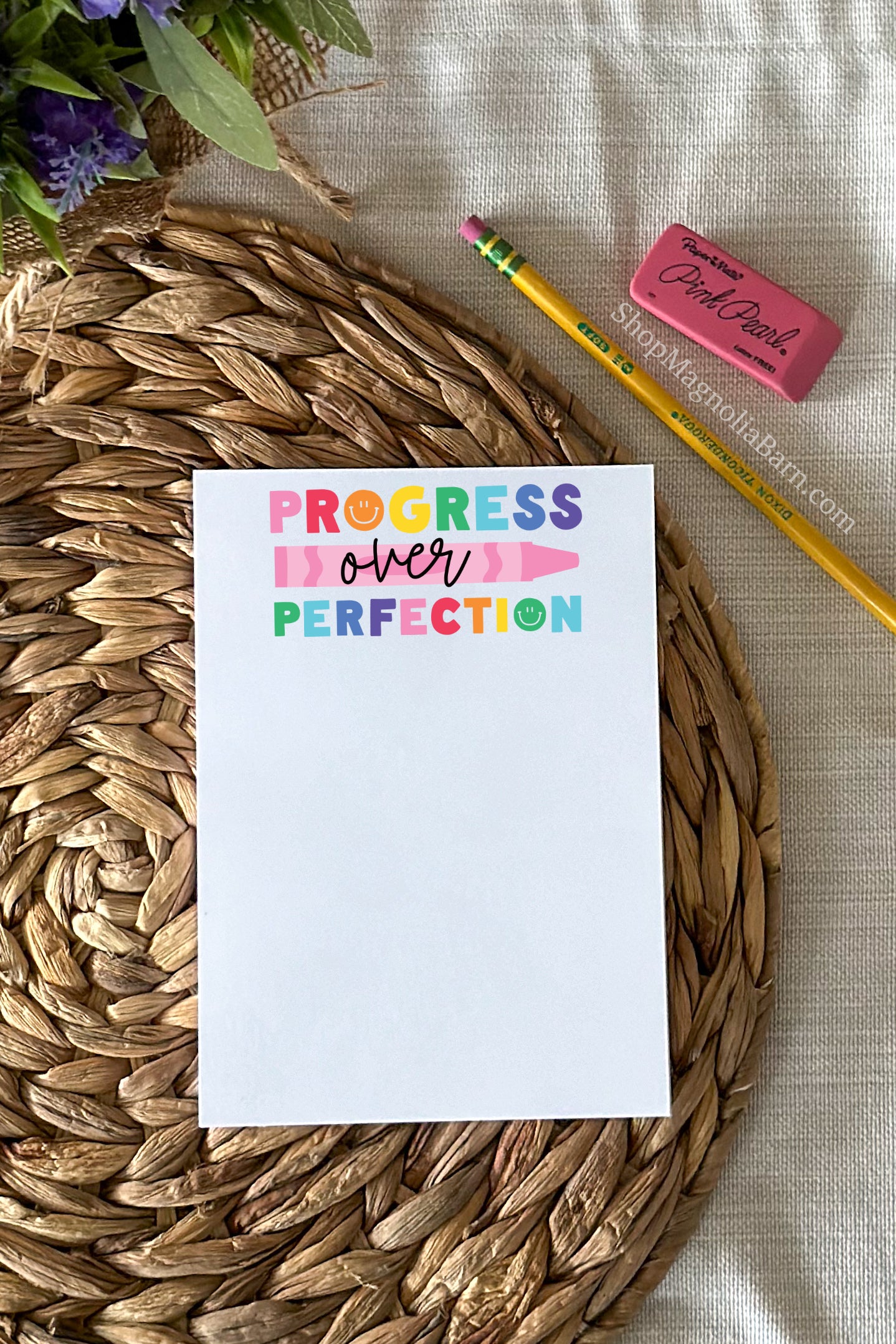 Looking for an inspiring and thoughtful gift, but unsure if you should go with something personalized? This handmade notepad might be just what you need! Featuring the vibrant and encouraging message, "Progress Over Perfection," this notepad is a perfect way to uplift and motivate anyone striving for their goals.