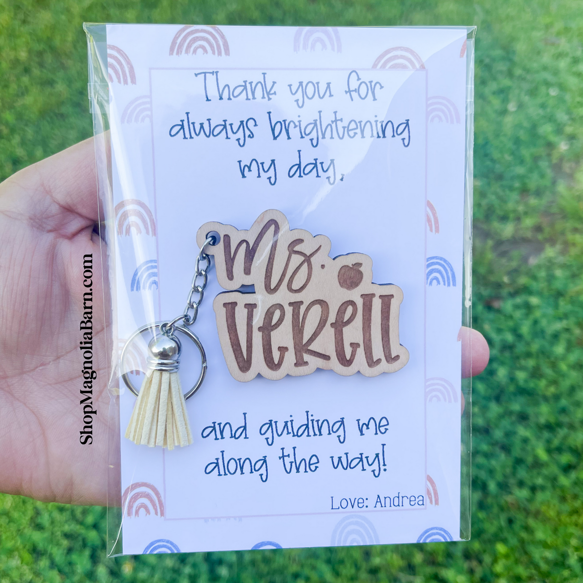 Brighten a teacher's day with this unique personalized gift—a beautifully handcrafted wooden keychain engraved with their name, paired with a soft tassel. This thoughtful gift is not only meaningful but also practical, making it a perfect choice for teacher Christmas gifts, a teacher appreciation gift idea, or a teacher end of the year gift.