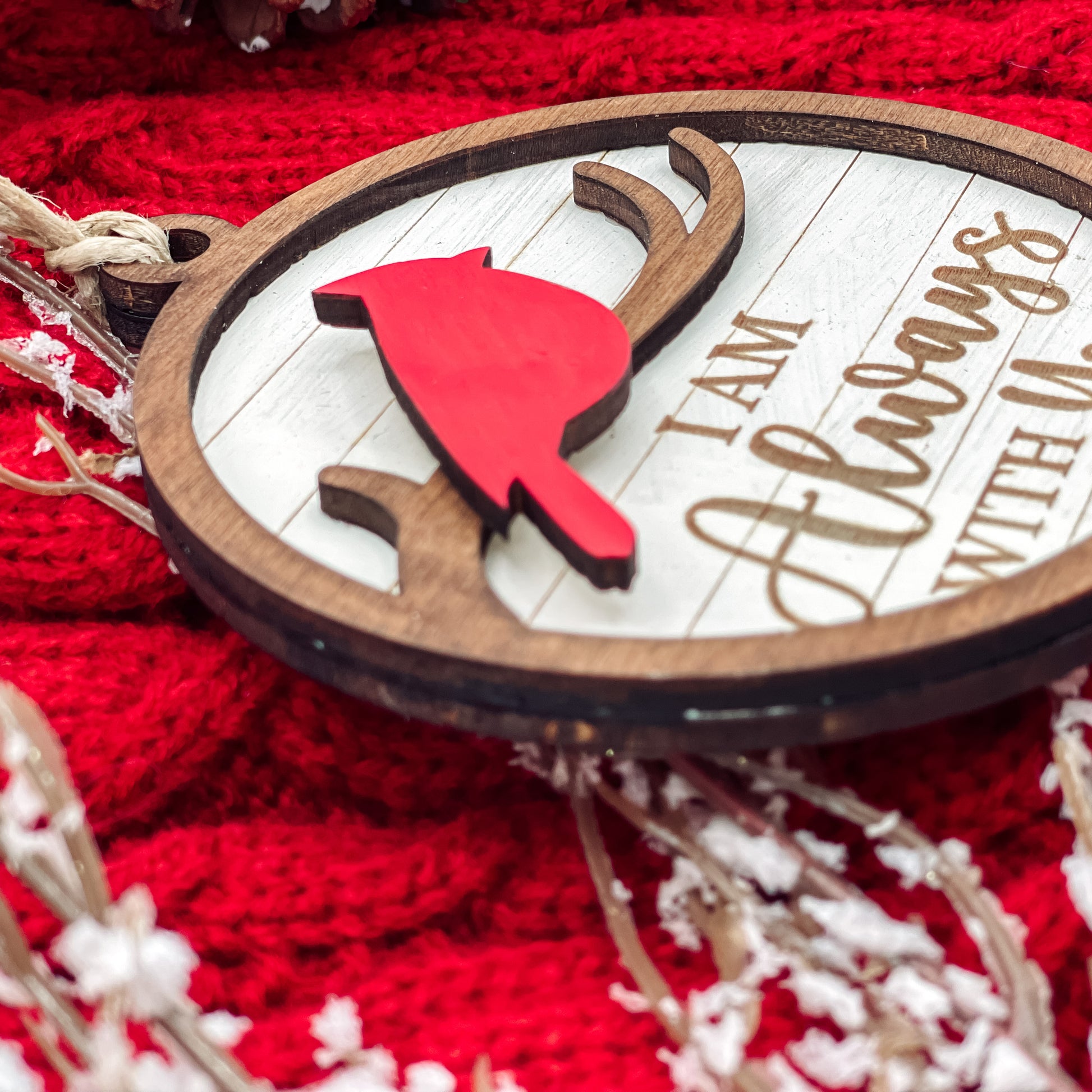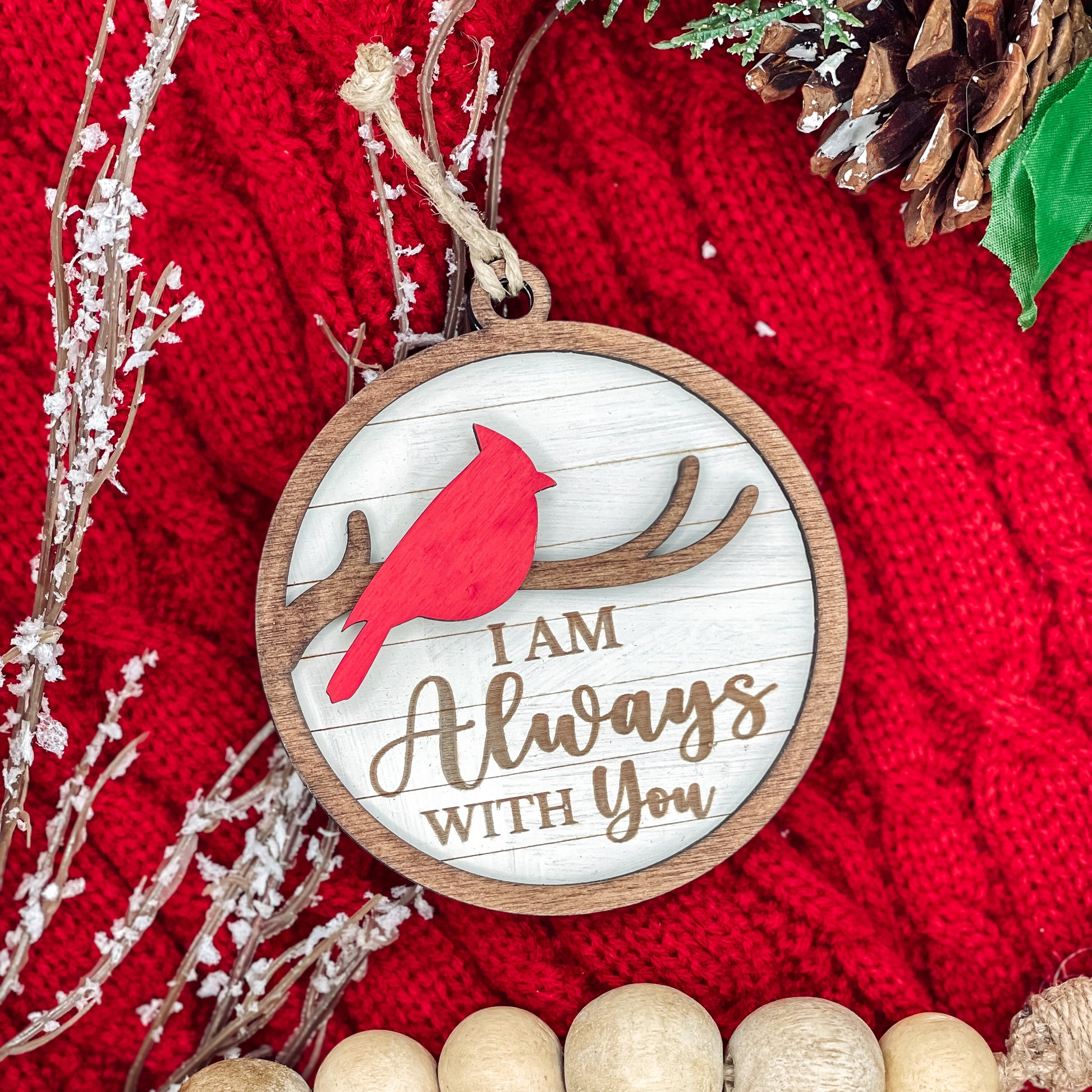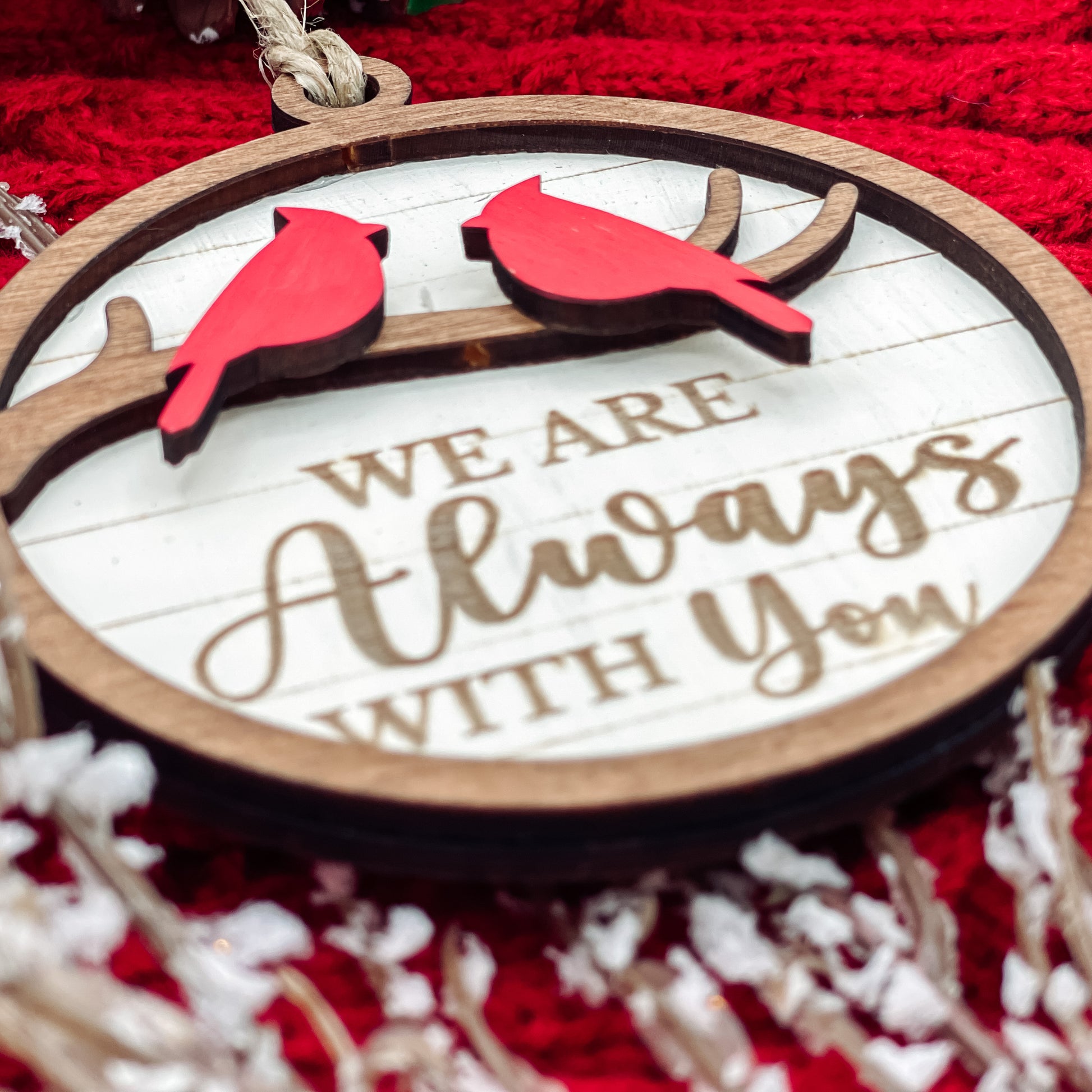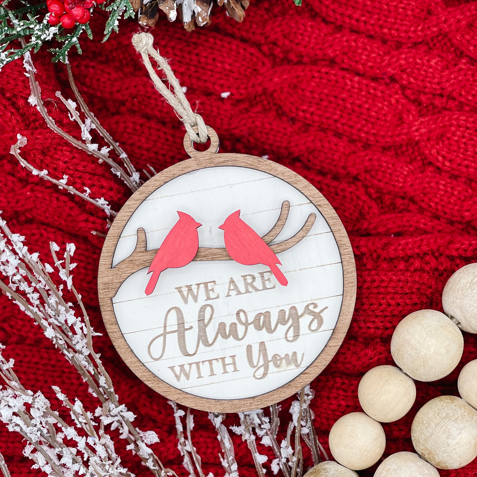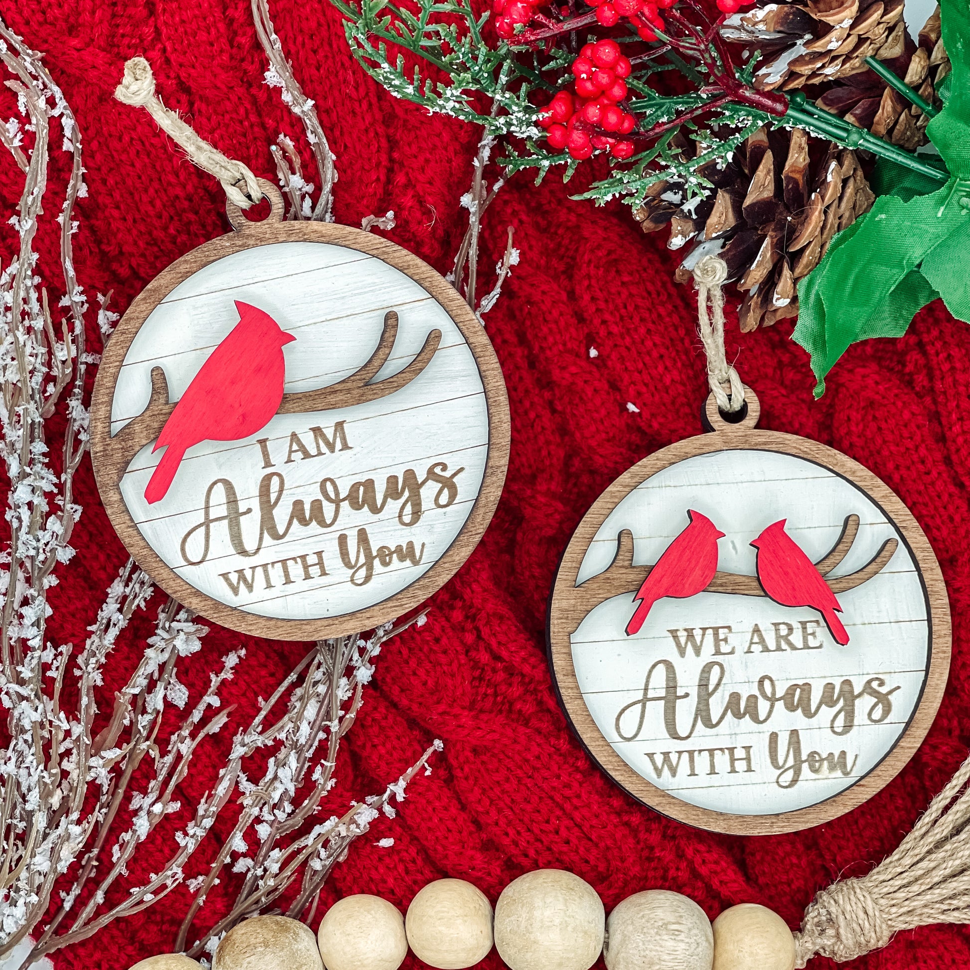 Celebrate the memory of your loved ones this holiday season with our beautifully handcrafted 3D wooden ornament. Featuring a vibrant red cardinal, a symbol of remembrance and love, this unique piece offers two customizable options: "I Am Always With You" or "We Are Always With You". Whether you're honoring a single loved one or a cherished group, this ornament serves as a comforting keepsake during the holiday season and beyond.