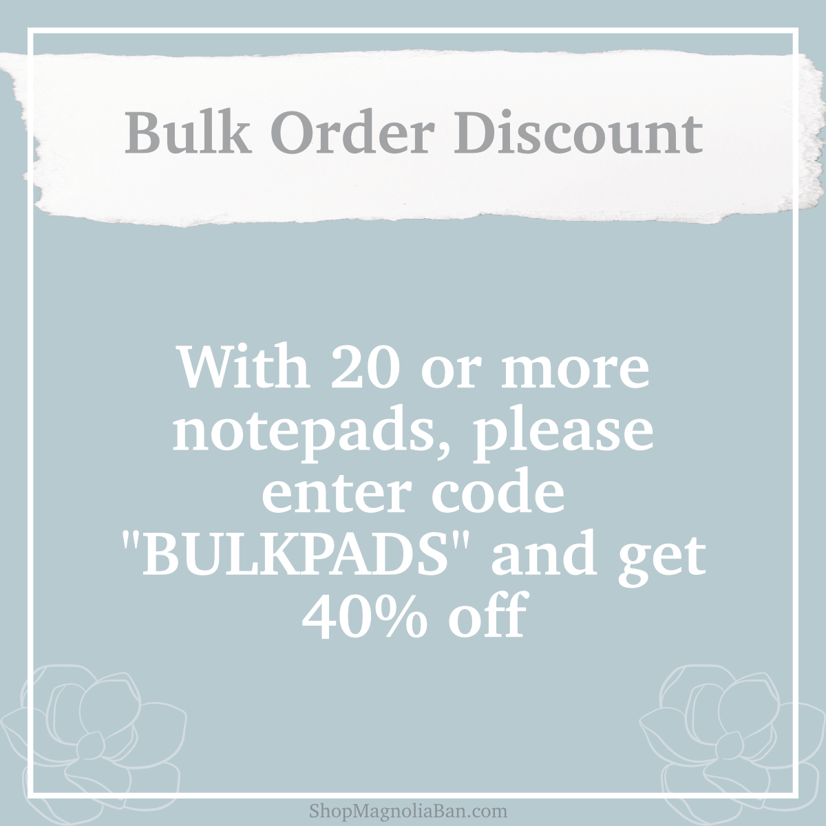 Are you interested in ordering 20 or more notepads? Please contact me for Bulk ordering, they do NOT all have to be the same design (example all elementary teacher staff with different names/ designs)