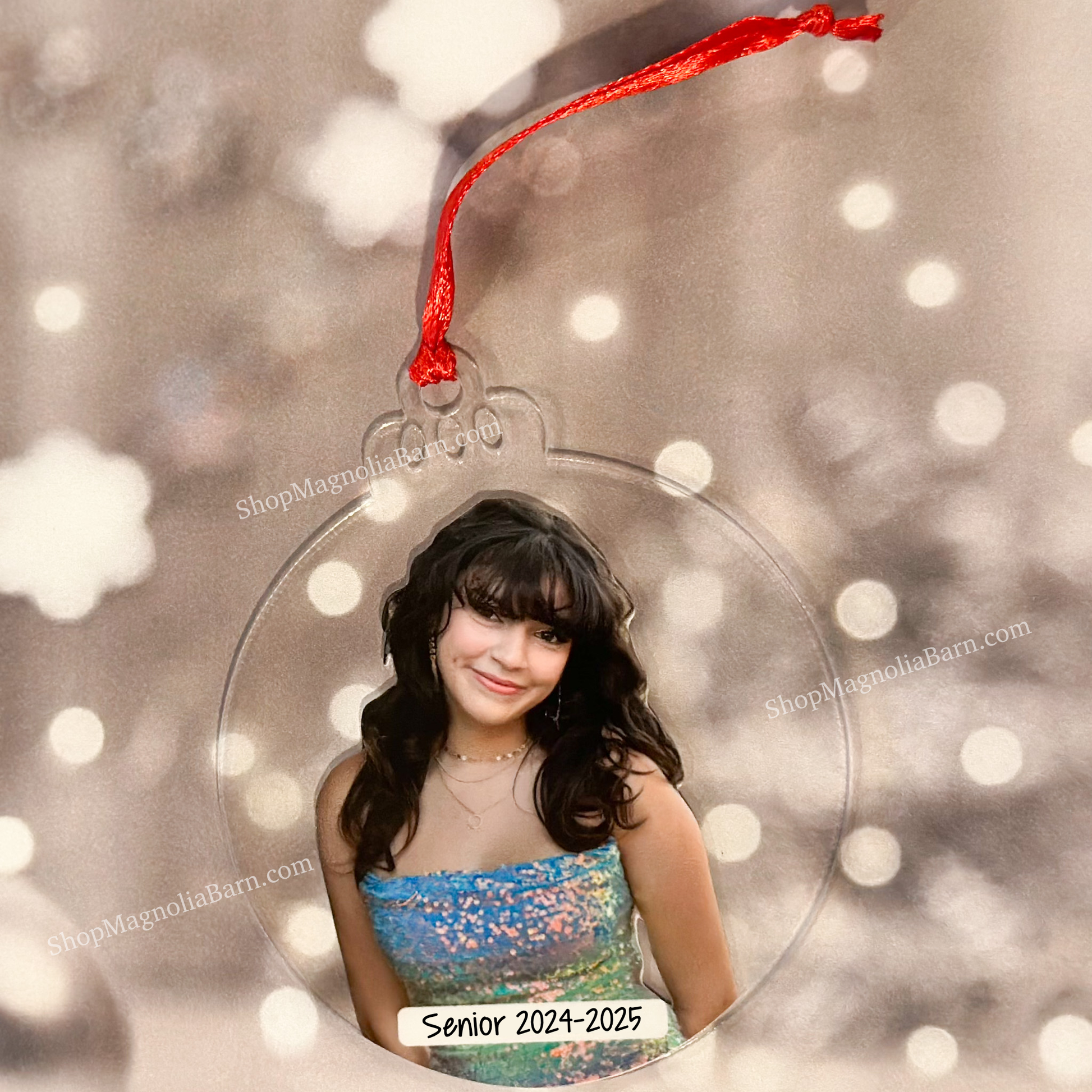 "First Christmas," "Prom," "Homecoming," or any significant milestone, this ornament is an ideal way to celebrate special moments from the year. Made from clear acrylic, it showcases your chosen photo with a personalized label, bringing a unique touch to your holiday decor. With a festive red ribbon, it’s ready to hang on the tree or display as a keepsake. Create a timeless memento that you or a loved one will treasure for years to come.