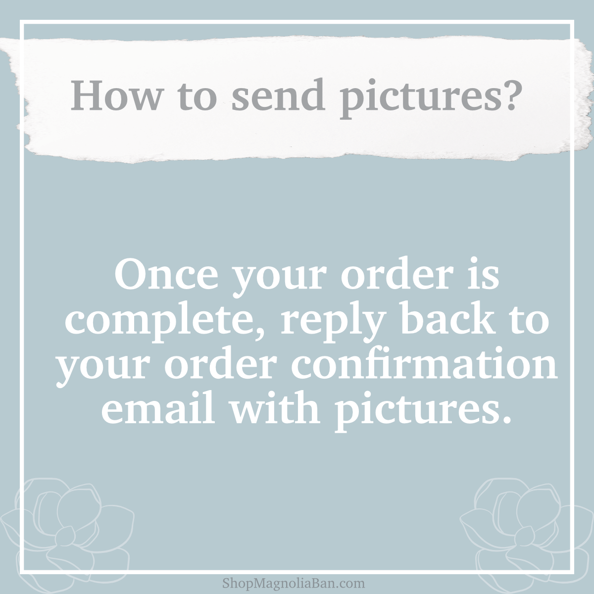 Pictures: Once your order is complete, reply back to your order confirmation email with pictures.