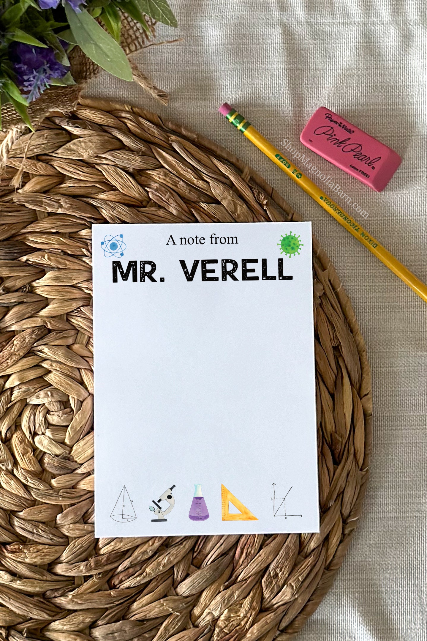 Add a personal touch to your notes with this custom 5x7 notepad, perfect for teachers, science enthusiasts, or anyone who loves a bit of creativity in their stationery. Printed on high-quality, smooth paper, each of the 50 pages features a clean, lined design, providing ample space for jotting down reminders, to-do lists, or thoughtful messages. The vibrant, science-themed illustrations—complete with an atom, a microscope, and more—add a playful yet professional vibe. Whether it's a note to a student, a colleague, or yourself, this notepad ensures your message is delivered in style.