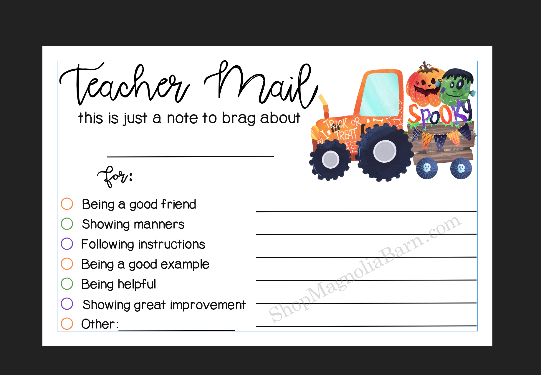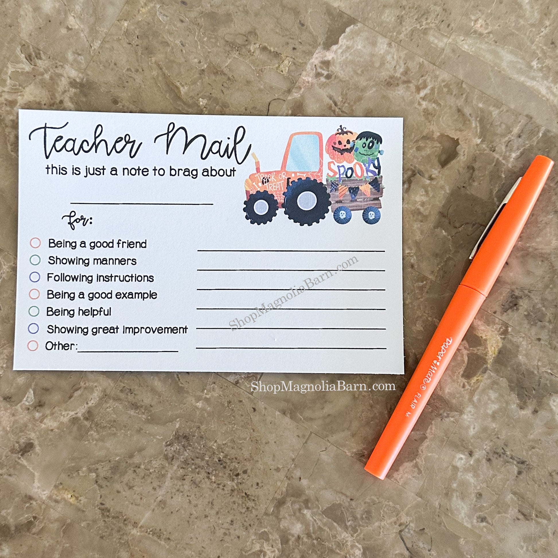 A warm and positive boost with this Teacher Mail Digital Download with a Spooky Tractor.