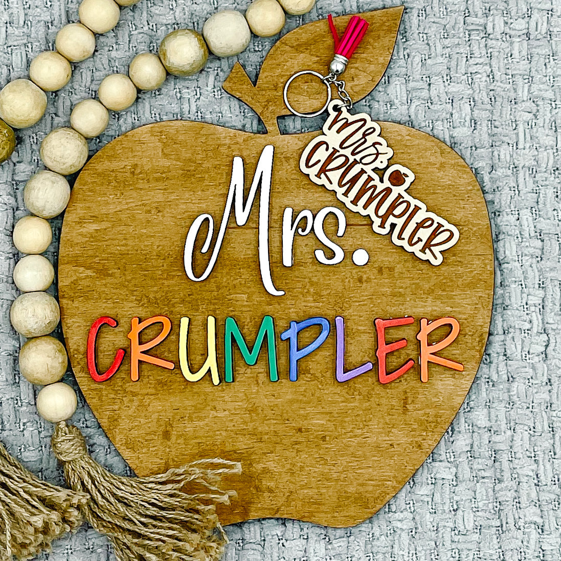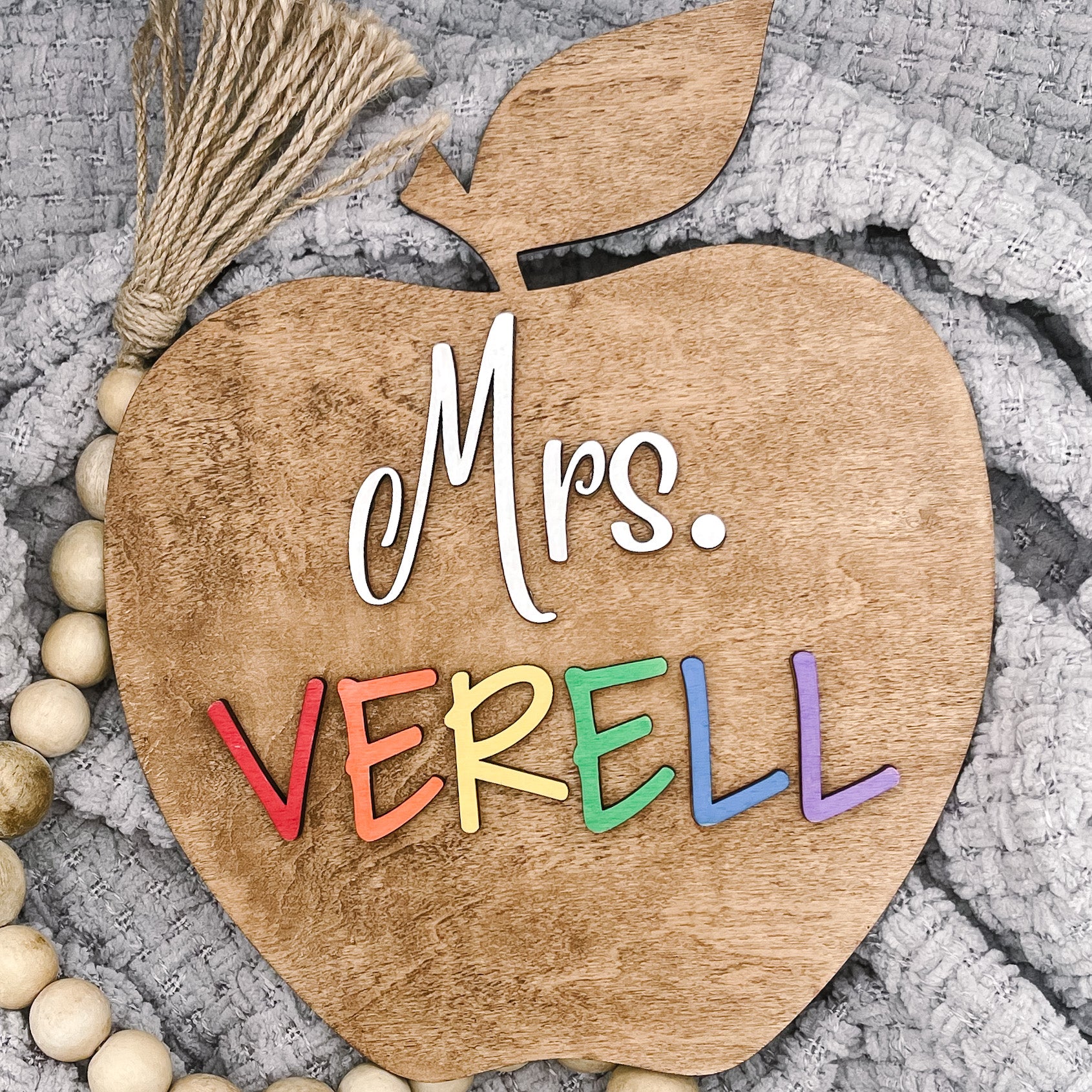 This beautiful wooden apple decoration is the perfect addition to any classroom or a thoughtful gift for your favorite teacher. Measuring approximately 11"x9", this handcrafted piece features a stunning 3D effect with layered, painted wood. The teacher's name stands out in bold rainbow colors, adding a vibrant and personalized touch. Ideal for brightening up classroom decor or showing appreciation for educators, this unique piece is both stylish and meaningful.
